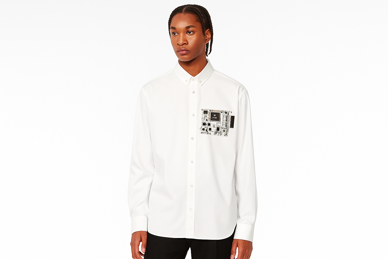 Signature Insignia: a crafted pocket built from real and simulated microchip parts—soldered circuits, silicon wafers, and hardware fragments. It’s a wearable sculpture that’s both functional and a symbol of humanity merging with technology.